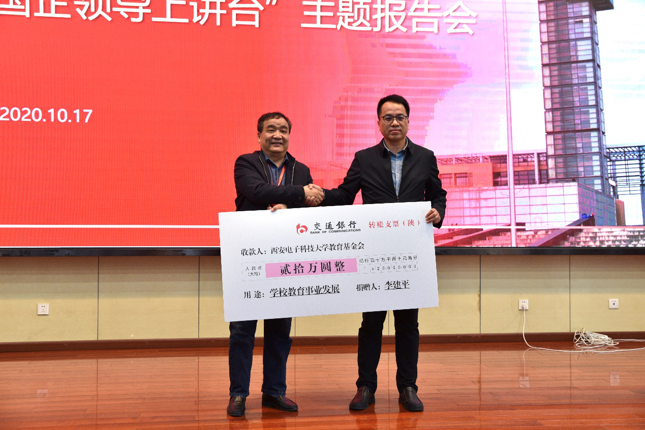2-781班校友代表薛敏彪代表2-781班致辞。他首先表明了设置奖学金的初衷和缘由:希望表彰优秀学生以此激励各位学弟学妹努力学习、奋力拼搏,未来为行业发展和民族复兴做出更大的贡献。他说:“过去四十年以来,时代变了,城市变了,校园变了,但坚持学校的校训没有变,为国家发展和强大不懈奋斗的理想没有变。”未来四十年,国家正在向社会主义现代化国家奋进,他希望学弟学妹们抓住时代机遇,将个人理想与国家未来相结合,实现人生价值。副校长石峰接受捐赠并向李建平校友颁发捐赠证书。
