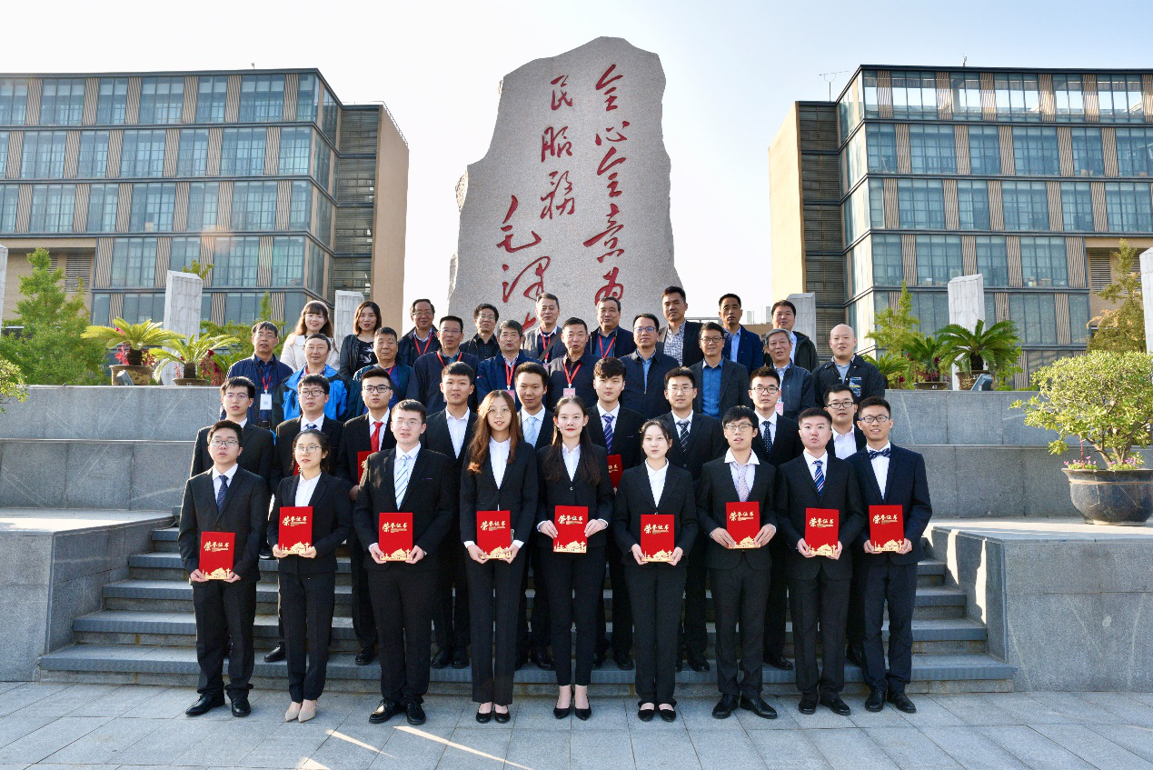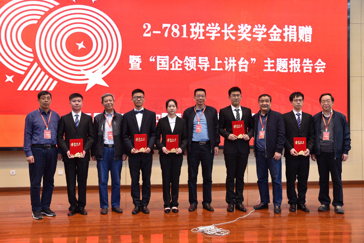6165cc金沙总站检测中心副书记刘建锋宣读《6165cc金沙总站检测中心关于给陈世豪等18名同学发放2020年“2781班学长奖学金”的决定》,2-781校友代表、副校长石峰为获奖学生颁奖并亲切合影留念。