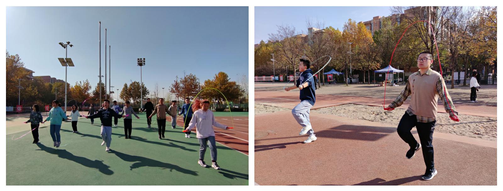 最先进行的是跳绳比赛,在规定一分钟时间内完成次数最多者获胜。比赛开始前,同学们聚集在一起赛前热身,各色的跳绳在冬日的暖阳里上下翻飞、光彩夺目,引得操场上的同学纷纷驻足观看。经过激烈的初赛与决赛,2020级王雅琦同学获得女子跳绳比赛第一名,2019级杨小辰同学获得男子跳绳比赛第一名。
