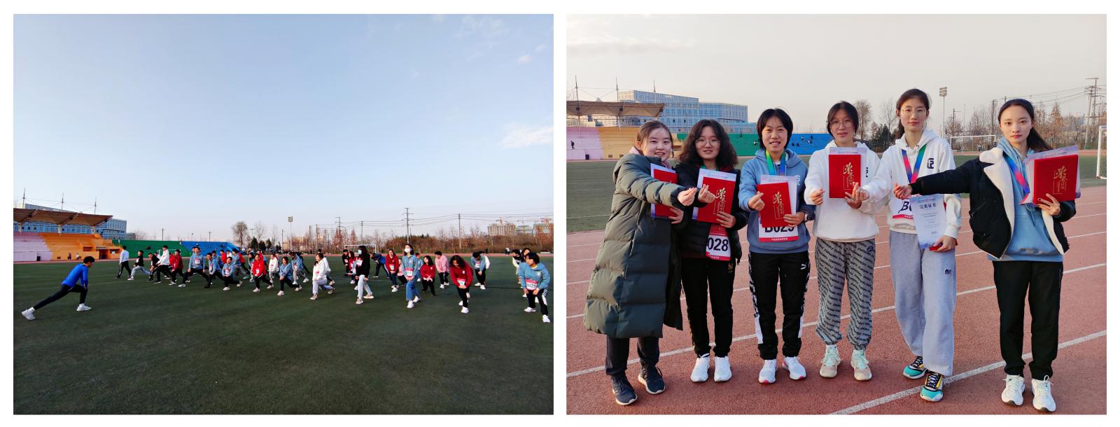 操场健身跑项目设置男子3km、女子2km两组,参赛选手们统一身穿定制运动卫衣,佩戴号码布。为了更好的适应冬季长跑,比赛开始前,由体育委员带领所有参赛选手进行赛前热身,调整身体状态。随着发令枪响,运动员们像离弦的箭一般向前冲去, 场外同学们的加油声、呐喊声此起彼伏,经过激烈的追逐,最终,2020级和欣然同学获得女子2KM操场健身跑第一名,2019级刘东翰同学获得男子3KM操场健身跑第一名。