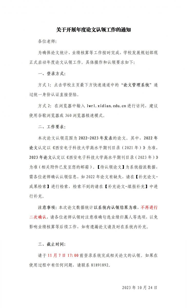 关于开展年度论文认领工作的通知2023-10-24 15:05:47浏览次数: 责任编辑:赵彤璐 上一篇文章:关于办理2023年下学期本科教学准入证的通知下一篇文章:关于征集2024年“德显”科创实训计划课题的通知