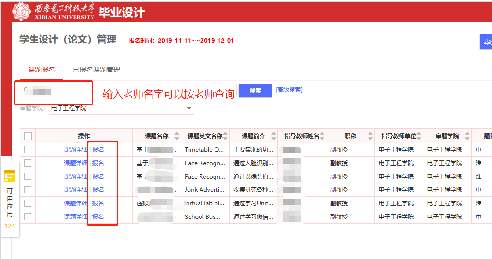 11月13日至11月23日,学生登录学校一站式网上办事大厅教务系统(http://ehall.xidian.edu.cn)毕业设计模块(以下简称毕设系统)进行选题。