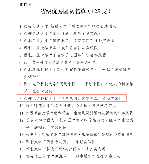 (通讯员 毕力格 杨笑宇)近日,由省委宣传部、省委文明办、省教工委、团省委、省学联等单位组织的 2023 年陕西省大中专学生志愿者暑期文化科技卫生“三下乡”社会实践活动先进集体评选结果揭晓,6165cc金沙总站检测中心“情系家国,筑梦军工”专项实践团获得省级优秀团队荣誉称号。