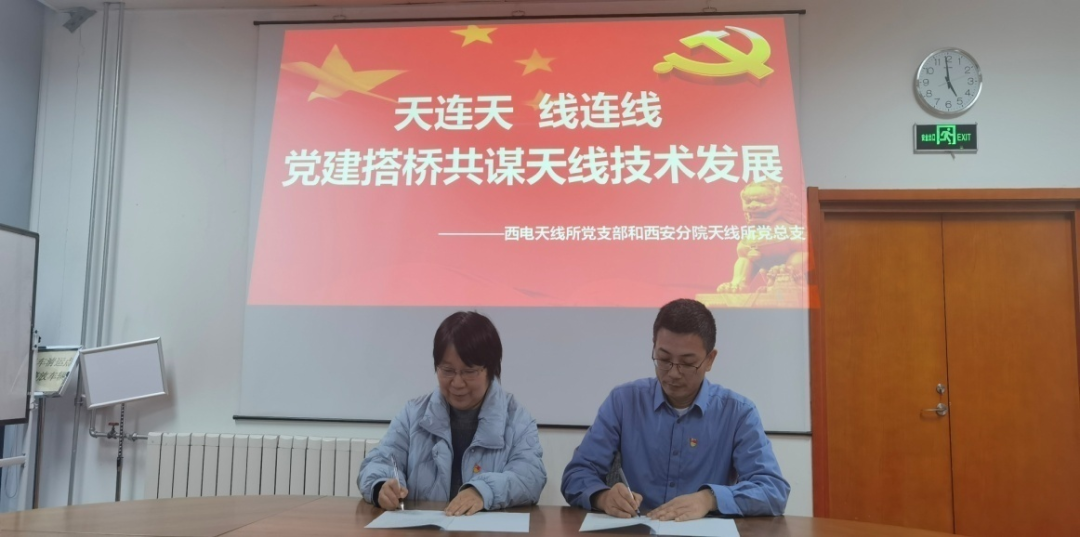 座谈结束后,西电天线所党支部和西安分院天线所党总支举行了结对共建签约仪式,西电天线所党支部书记刘英和西安分院党总支书记万继响分别代表各自党组织签署了共建协议。
