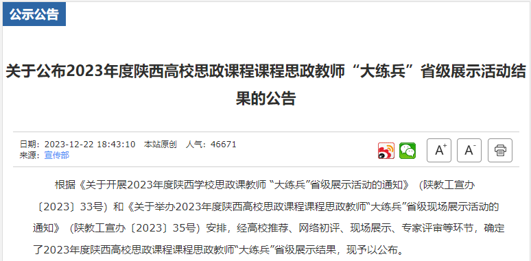 据悉,“大练兵”是陕西省打造的一项思想政治工作品牌活动,经各高校推荐、省级网络初评,本次全省共有79所高校240名选手晋级省级现场展示。通过现场展示教学环节的激烈角逐,共评选出思政课程“教学标兵”54名,课程思政“教学标兵”22名,思政课“教学团队标兵”8个。现场展示活动在全省高校开设线上分会场,近3万名干部师生在线观摩。