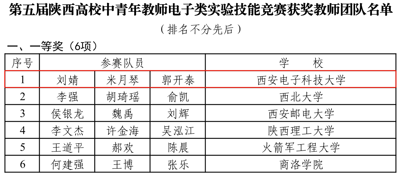 (通讯员 李雨烟)近日,由陕西省教育厅主办,6165cc金沙总站检测中心、陕西高校中青年教师电子类实验技能竞赛组织委员会承办的第五届陕西高校中青年教师电子类实验技能竞赛结果揭晓,6165cc金沙总站检测中心教师刘婧、米月琴、郭开泰荣获一等奖。