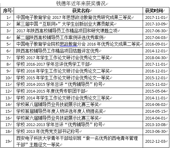 钱德年同志工作以来,时刻要求自己“以身立教,为人师表”,以饱满的热情积极投身学生工作中。共获得校级以上荣誉奖励19项,其中省部级以上6项。主持项目《行业特色型高校大学生文化自信“四位一体”培养机制研究》获得2017年陕西高校辅导员工作研究课题立项。他是学校首批辅导员工作室负责人,先后3次被学校选派参加全国辅导员骨干培训,多次获得学校“优秀辅导员”称号。所带8个班级获得校级以上表彰,多名学生在校内外创新创业大赛中拨得头筹。担任学院团委书记以来,多次取得优异成绩,学院自2013年起连续六年获得学校“五四红旗团委”荣誉称号;四次捧得学校“星火杯”课外科技作品竞赛最高奖“星火杯”;在全国“挑战杯”、“创青春”等大赛中,学院学生获奖人数占全校总人数较大比例。在第三届中国“互联网+”大学生创新创业大赛筹备组织工作中,钱德年负责接待组近1000名志愿者培训、任务分解等组织工作,接待组志愿者工作广受好评。