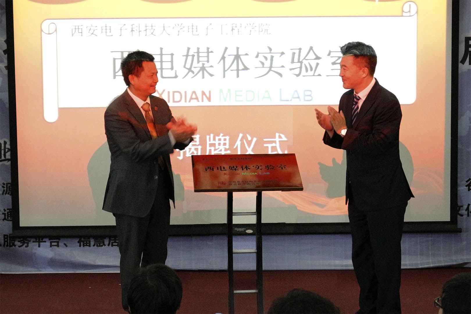 出席嘉宾合影留念后,伴随着热烈的掌声,“西电媒体实验室”成立暨揭牌仪式圆满结束。